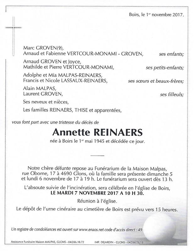 Décédée à Boirs (4690) le mercredi 1 novembre 2017 à l'âge de 72 ans