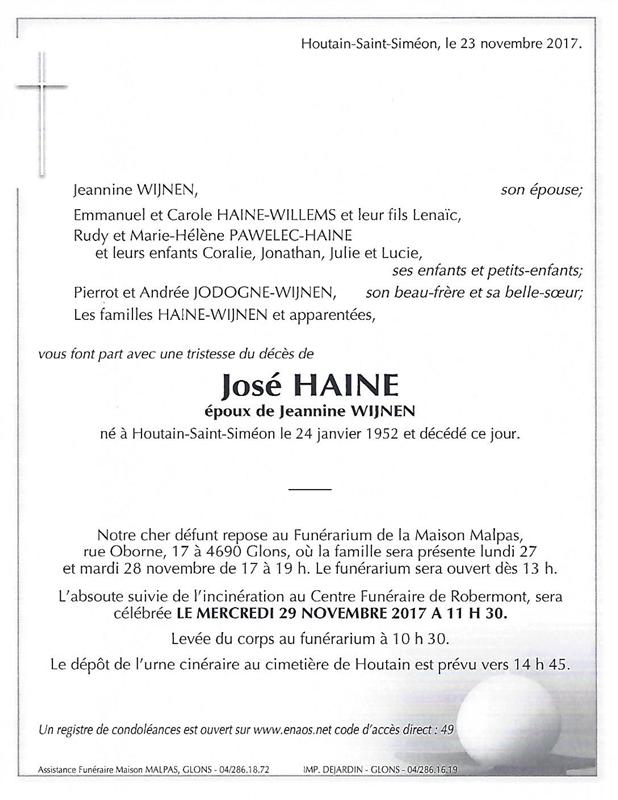 Décédé à Herstal (4040) le jeudi 23 novembre 2017 à l'âge de 65 ans