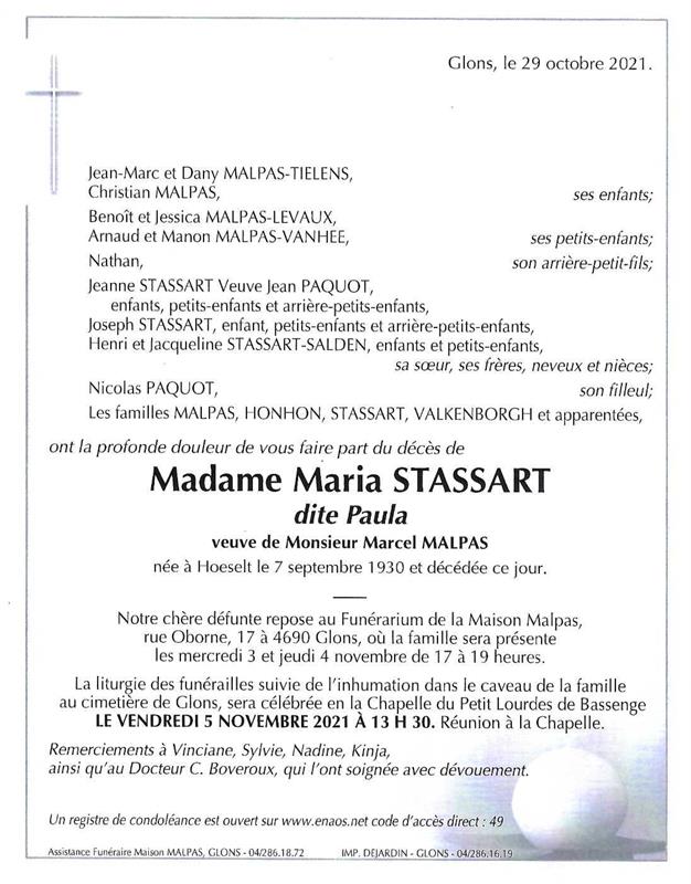 Décédée à Glons (4690) le vendredi 29 octobre 2021 à l'âge de 91 ans