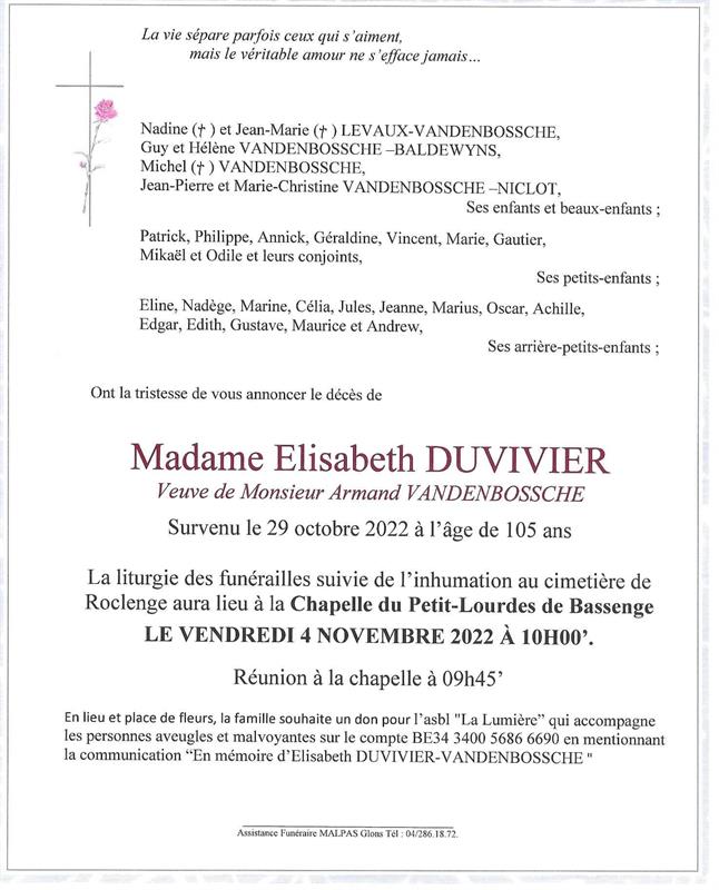 Veuve de Monsieur Armand VANDENBOSSCHE