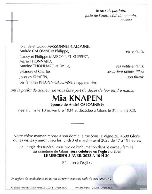 Décédée à Glons (4690) le vendredi 31 mars 2023 à l'âge de 88 ans