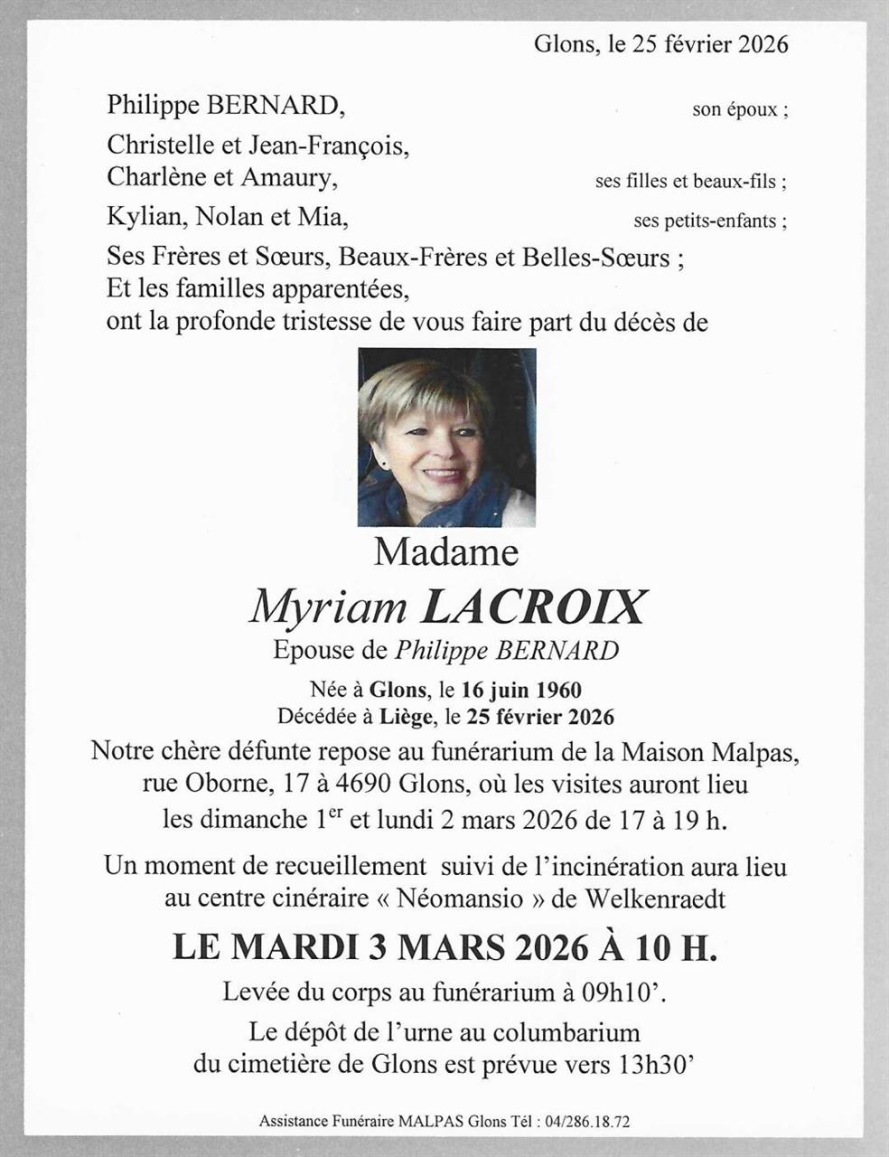 Décédée à Liège (4000) le mercredi 25 février 2026 à l'âge de 65 ans