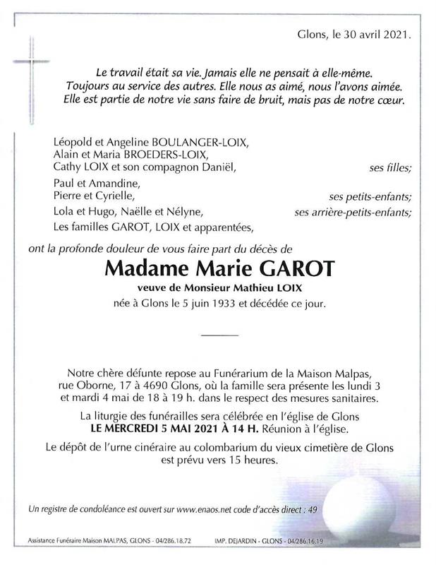 Décédée à Glons (4690) le vendredi 30 avril 2021 à l'âge de 87 ans